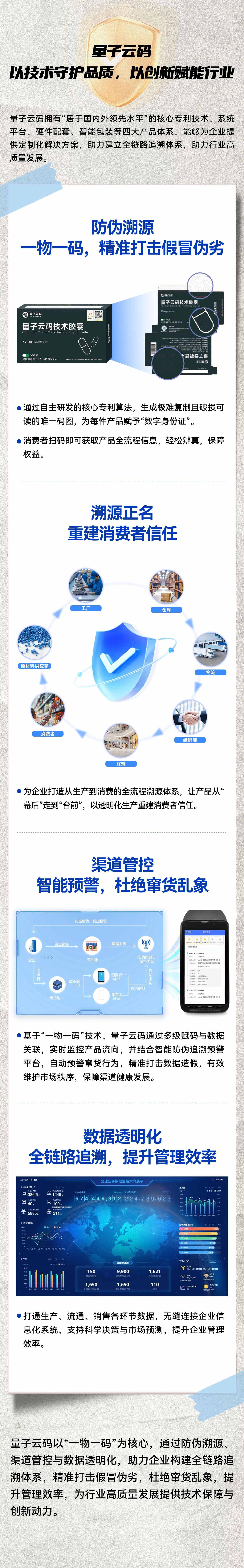 政策的实施为消费品行业的高质量发展提供了保障,并为企业指明了方向:技术创新与标准化建设是赢得消费者信任和市场认可的关键。作为一物一码综合解决方案服务商,量子云码积极响应政策,通过技术创新助力行业高质量发展,守护消费者权益。