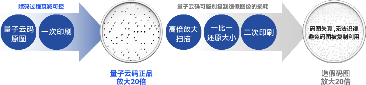 运用量子云码隐蔽码技术,为商品或商品包装、标签赋予隐蔽标记,难以发现破坏,企业可通过专用稽查设备识别,确定商品真伪。